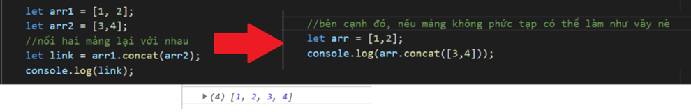 Sao chép mảng cũ và thêm mảng mới, hay còn gọi tắt là nối mảng, như hình trên, arr đã nối với mảng [3,4] mới, và giá trị mới. Bạn có thể vừa nối mảng, vừa nối giá trị với mảng cũ và không làm thay đổi mảng cũ.